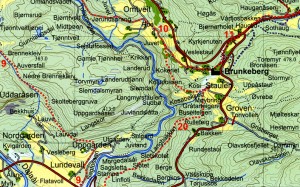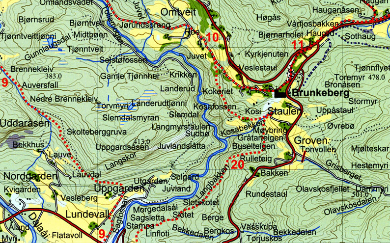 Nå ligg der fin og jamn veg gjennom bygda anten du kjem frå Sundbygdi eller frå Seljord. Men den gongen var det ikkje slik. Vegen frå Sundbygdi gjekk då frå Dampedalen opp forbi Slóte med svære lange bakkar opp mot Grovegardane, og aller brattast til slutt opp til Brunkeberg kyrkje. Så bar det nedover att frå Veslestaul forbi Omtveitgardane nordover til Jøronsprang.